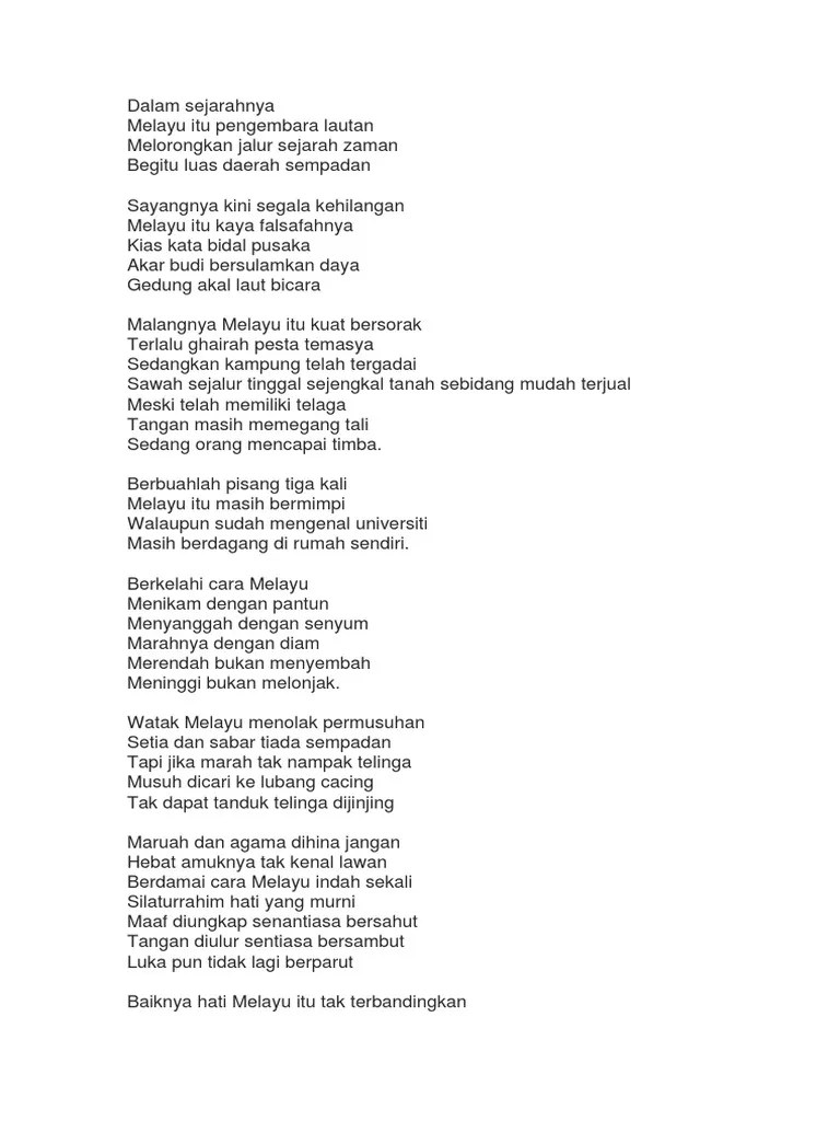 7 15 mb melayu usman awang download lagu mp3 gratis mp3 dragon. Terkenal dengan nama penanya tongkat warrant, beliau adalah seorang penyair dan ahli drama yang prolifik ketika hayatnya. Melayu itu orang yang bijaksana. Duri dan api by usman awang. Sajak guru usman awang koleksi puisi. Kosong di jiwa tiada penghuni. Sajak "melayu" oleh usman awang melayu icu orang yang bijaksana nakainya bersulam jenaka budi bahasanya tidak erkiea kurang ajaraya retap sancun jika menipu . Sajak yang indah nukilan usman awang. 1.1 pandangan usman terhadap melayu dan ke melayuan dalam sajak "melayu" sajak "melayu (1992) karya usman awang memperlihatkan keistimewaannya tersendiri . Berkaitan dengan ketuanan dan kedaulatan melayu, usman awang melalui puisi melayu menjelaskan dengan panjang lebar tentang definisi dan akal . Blog ini memuatkan himpunan puisi klasik dan moden yang segar sepanjang zaman, nukilan penyair terkenal seperti khalil gibran, umar khayyam, .