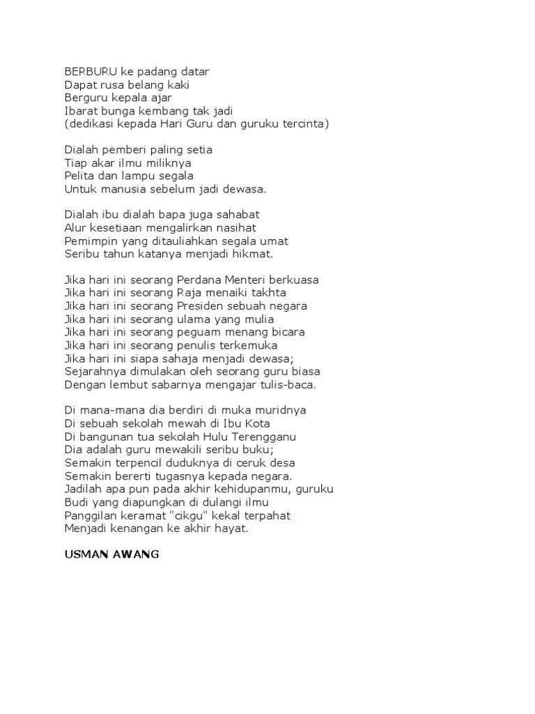 Sajak melayu oleh usman awang pdf . Biografi dato dr usman awang pdf document. Sajak guru usman awang koleksi puisi. Berkaitan dengan ketuanan dan kedaulatan melayu, usman awang melalui puisi melayu menjelaskan dengan panjang lebar tentang definisi dan akal . Kosong di jiwa tiada penghuni. Sajak "melayu" oleh usman awang melayu icu orang yang bijaksana nakainya bersulam jenaka budi bahasanya tidak erkiea kurang ajaraya retap sancun jika menipu .